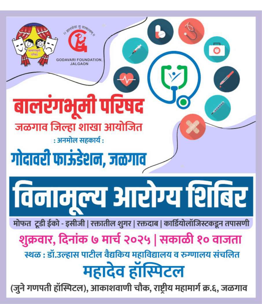 बालरंगभूमी परिषदेच्या अध्यक्षा ॲड.निलम शिर्के सामंत यांच्या संकल्पनेतून आकारास आलेल्या या उपक्रमात महाराष्ट्रातील बालरंगभूमी परिषदेच्या सर्व शाखा या मोफत आरोग्य तपासणी शिबिराचे आयोजन करीत आहेत. बालरंगभूमी परिषदेच्या जळगाव जिल्हा शाखेतर्फे गोदावरी फाऊंडेशनच्या सहकार्याने आज (दि.७) सकाळी १० वाजता डॉ.उल्हास पाटील वैद्यकिय महाविद्यालय व रुग्णालय संचलित महादेव हॉस्पिटल, जुने गणपती हॉस्पिटल, आकाशवाणी चौक, जळगाव येथे मोफत आरोग्य तपासणी शिबिराचे आयोजन करण्यात आले आहे.