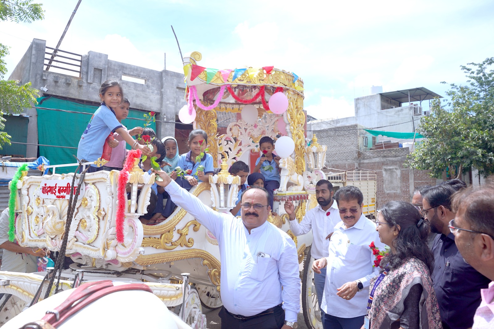 या प्रवेशात्सवाचे प्रमुख आकर्षण इ.1लीच्या सर्व नवोगत विद्यार्थ्यांना घोड्याच्या बग्गीमध्ये बसवून शाळेत आणण्यात येवून त्यांचे पुष्पगुच्छ देवून स्वागत करण्यात आले. तसेच सर्व नवोगत विद्यार्थी व इ.8 वी पर्यंतचे सर्व विद्यार्थ्यांना मोफत पाठध-पुस्तक, मोफत गणवेश, मोफत बुट व सॉक्स, स्कुल बॅग व शैक्षणिक साहित्य मान्यवरांचे हस्ते देण्यात आले. सुरेश दामु भोळे, आमदार जळगाव शहर यांनी विद्यार्थ्यांच्या सर्वांगिण विकासासाठी क्रिडा क्षेत्रात पण लक्ष केंद्रीत करणे आवश्यक म्हणून शाळेमध्ये दररोज शारिरीक शिक्षणाचा तास घेण्यात यावे. तसेच आयुक्त, मनपा जळगाव ज्ञानेश्वर ढेरे यांनी विद्यार्थ्यांची शैक्षणिक गुणवत्ता वाढीसाठी सर्व शिक्षकांनी सातत्याने प्रयत्न करावे याबाबत मार्गदर्शन केले.