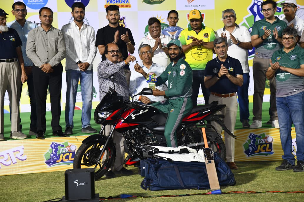 अमळनेर सुहांस जायंटचा शुभम शर्मा ला प्लेअर ऑफ द लीग म्हणून पल्सर मोटारसायकल, बॅट, पॅड्स, ग्लोव्हज, किट बॅग व ट्रॉफी
