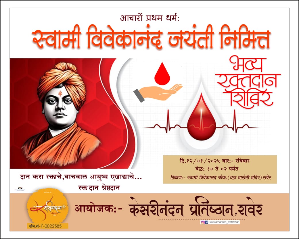 रावेर येथील केशरी नंदन प्रतिष्ठान तर्फे स्वामी विवेकानंद जयंती निमित्ताने दिनांक १२ जानेवारी रविवार रोजी वेळ सकाळी १० वाजेपासून ते दुपारी ४वाजेपर्यत रक्तदान शिबीर आयोजन स्वामी विवेकानंद चौक थडा मारोती मंदिर येथे होणार आहे तरी स्वामी विवेकानंद जयंती निमित्ताने आयोजित रक्तदान शिबीरामध्ये आपली उपस्थिती देवून रक्तदान करावे असे आवाहन केशरी नंदन प्रतिष्ठान आयोजकां कडून करण्यात आले आहे