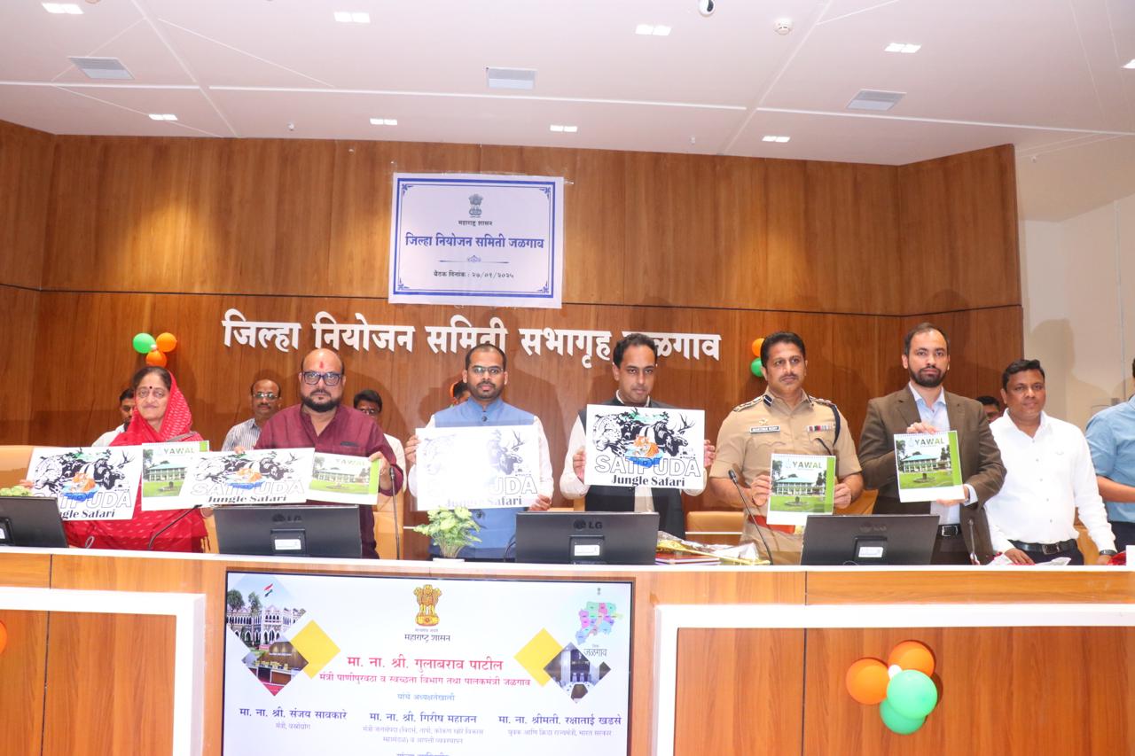 जळगाव : जिल्हा नियोजन समितीच्या बैठकीत वन विभागाच्या सातपुडा जंगल सफारी बोधचिन्हाचे अनावरण तसेच वन विभागाचे कॉफी टेबल बुक आणि सचित्र दिनदर्शिकेचे प्रकाशन पालकमंत्री गुलाबराव पाटील, खासदार स्मिता वाघ, जिल्हाधिकारी आयुष प्रसाद, जिल्हा पोलीस अधीक्षक डॉ. महेश्वर रेड्डी, जिल्हा परिषदेचे मुख्य कार्यकारी अधिकारी अंकित, उपवन संरक्षक जमीर शेख, जिल्हा नियोजन अधिकारी विजय शिंदे यांच्या हस्ते करण्यात आले.
